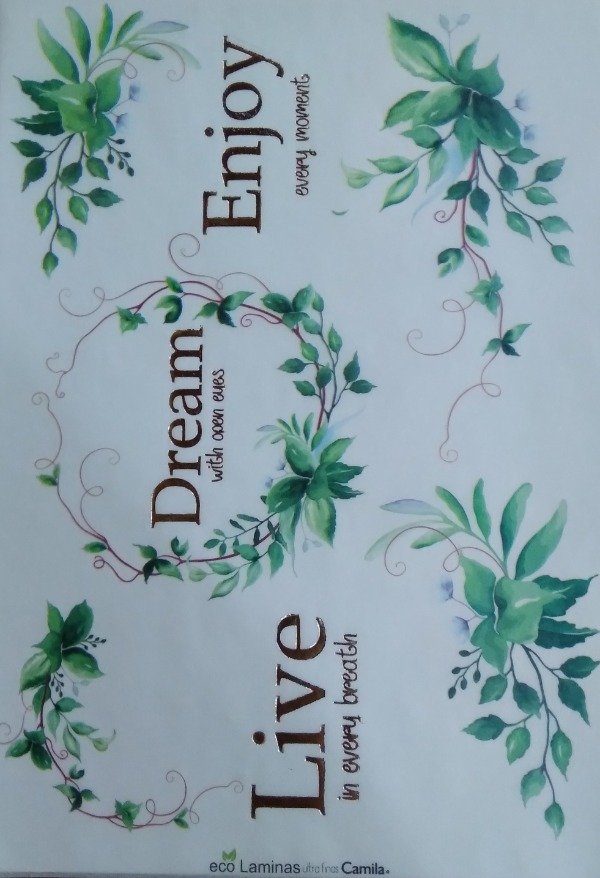Eco lámina impresa en Papel Manteca Ultra fino con detalles en Hot Stamping (foil) dorado Se adaptan a cualquier superficie, madera, vidrio, latas, cartón,etc. Se pueden pegar con los siguientes pegamentos: Multiuso Multipropósito Se pueden proteger sin inconvenientes con Laca al Agua , también puede utilizarse Barniz, cera o cualquier otro producto de protección, sin riesgo a que se corra la tinta, ya que las TODAS las láminas Camila están impresas en impresoras Laser, con tintas de excelente calidad. Al pegarlas, utilizar foil o folex, para presionar la lámina para que no generen arrugas. Luego de pegar la lámina en la superficie deseada, esperar a que el pegamento esté bien seco, para proceder a la protección. Al protegerlas utilizar un pincel sintetico suave. En el caso de surgir arrugas al colocar la Laca o Barniz, secar con secador, y una vez seco, presionar con foil y folex para quitar cualquier arruga generada. Si la lámina fué pegada correctamente, las arrugas desaparecen.